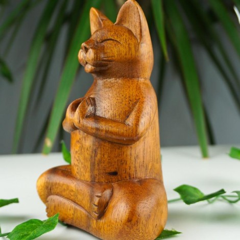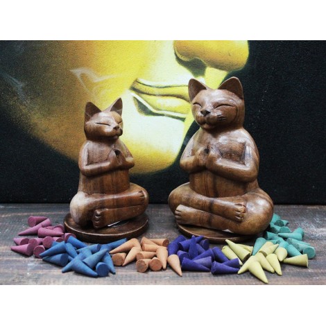 Ręcznie Robiony z drewna, w kształcie medytującego kota ze złożonymi łapkami, pod kadzidełka stożkowe.