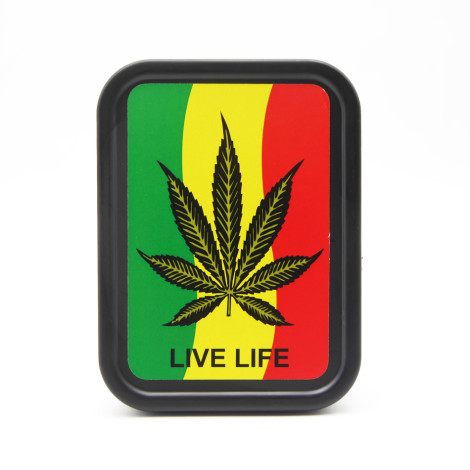 Lufka metalowa 7cm z zestawem sitek, mini plastikowy młynek oraz mały szklany pojemniczek. A wszystko w wygodnym plastikowym pudełeczku z rasta wzorem.