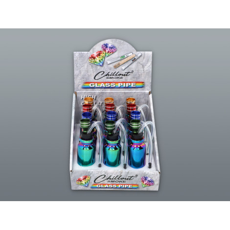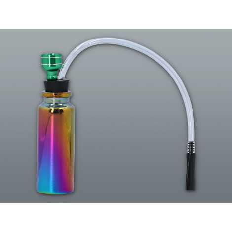Wyjątkowe szklane bongo, w kształcie przypominającym fiolkę na lekarstwa w kolorze mieniącej się metalicznej benzynki.