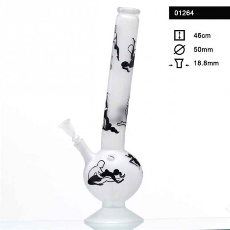 Wyjątkowe szklane bongo wykonane z pięknego mlecznego szkła. Dodatkowo bongo zdobią pozycję z KAMASUTRY, Robi wrażenie!!! :) Bongo starannie wykonane, posiada dużą bańkę w której mieszczą się pokaźne ilości dymku :)Bongos stoi na szklanej podstawce, dzięki czemu jest stabilne i nie tak łatwo je stłuc :) Wysokość bonga 46cm, cybuch na szlifie 18,8mm.