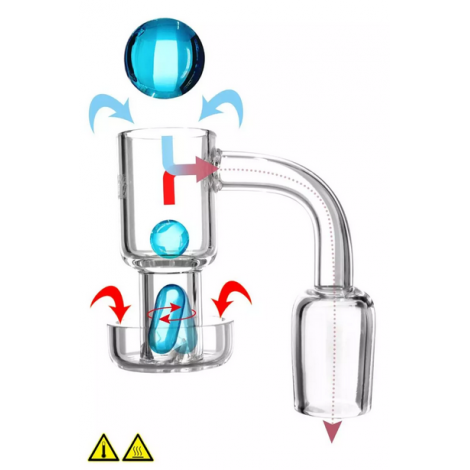 Pręt w kształcie pigułki zaczyna kręcić się w kółko podczas inhalacji. Stwarza to większą powierzchnię dla oleju i koncentratu do odparowania i zwiększa wytwarzanie pary. Oprócz zwiększonego ruchu powietrza i zwiększonej produkcji pary, pozytywnym efektem ubocznym jest to, że para nieco się ochłodzi, dzięki czemu jest przyjemniejsza. Dzięki tej misce kulka o średnicy 11,5 mm obraca się w kółko podczas inhalacji, pomagając zarówno zatrzymać ciepło, jak i zwiększyć powierzchnię do waporyzacji, zwiększając w ten sposób produkcję pary. Jak działa Terp Slurper? Włóż wszystkie kulki i pigułkę  do cybucha. Podgrzej go od dołu palnikiem lub zapalniczką przez 20-30 sekund, aż zacznie się świecić. Pozwól mu trochę ostygnąć (temperaturę możesz sprawdzić np. termometrem optycznym*). Dabberem rozprowadź koncentrat na dolnym rondlu i jednocześnie zacznij zaciągać powietrze.