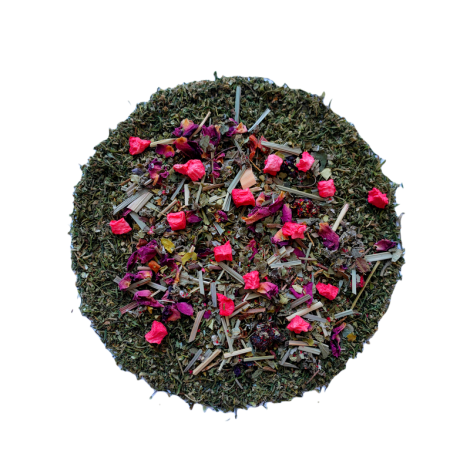 Składniki: 75% konopie włókniste zaw. CBD, moringa, papaja, malina, cytrynowa trawa, liście truskawki, aromat, werbena, granat, płatki róży, kwiaty granatu, czerwona porzeczka, malina liść.