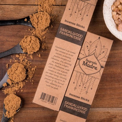 Rozkoszuj się wyjątkowym aromatem naturalnych a co najbardziej wyjątkowe: ręcznie robionych kadzidełek „Sagrada Madre” ze sproszkowanego drzewa sandałowego, olejku eterycznego z drzewa sandałowego i żywicy kadzidłowej, sklejonych spoiwem pochodzenia roślinnego.