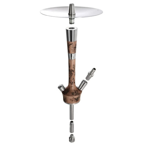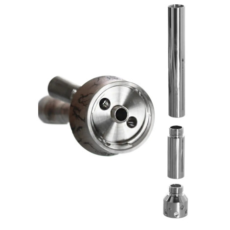 PODSTAWKA - Podstawka wykonana jest w stylu podstawki z zamkniętą komorą, co oznacza, że ma niewielką objętość wewnętrzną. Taka konstrukcja ułatwia zaciąganie się świeżym dymem lub wypuszczanie stęchłego lub spalonego dymu po dłuższych przerwach w paleniu. Podstawa wyposażona jest w dwa przyłącza do węży 18,8. Jedno przyłącze jest gotowe do użycia z adapterem na wąż 18,8. Druga zamykana jest kapturkiem z zaworem 18,8 (kula zaworu w komplecie). W przeciwieństwie do innych modeli INOX, można go łatwo odłączyć i zastąpić innym adapterem z wężem 18,8, aby móc korzystać z shishy w dwie osoby.