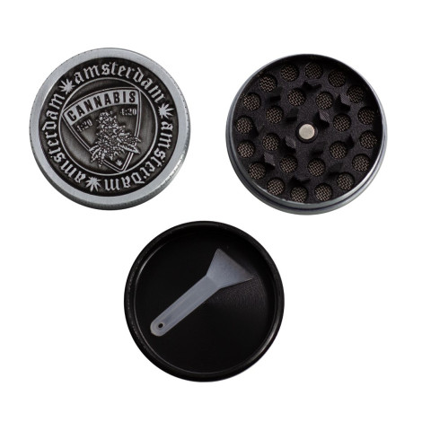 Młynek składa się z trzech części: magnetycznej pokrywy z komorą wyposażoną w ząbki w kształcie diamentów, zapewniające równomierne mielenie, drugiej komory oddzielonej metalową siatką do filtrowania pyłków, oraz trzeciej komory z mini skrobaczką do usuwania pozostałości materiału.