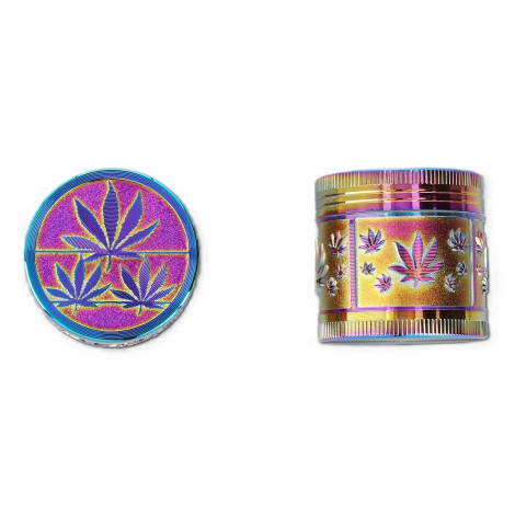 Grinder wykonany z metalu, posiada grawer we wzór liści konopi. Młynek posiada 3 komory, komora mieląca, pojemnik na susz, a w ostatniej zbiera się pyłek, który widzimy dzięki okienku, w zestawie również skrobaczka do pyłku.