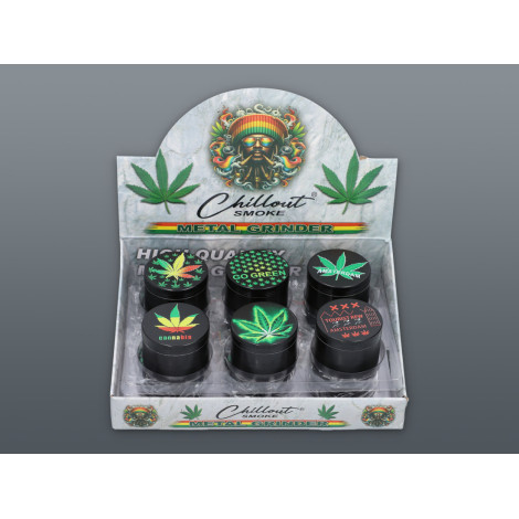 Średniej wielkości młynek z konkretnymi liśćmi Marihuany, które robią wrażenie od pierwszego spojrzenia.