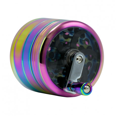 Duży, metalowy grinder z korbką, w kolorach tęczy. Posiada 3 komory, dzięki czemu można osobno uzyskać zmieloną zawartość, a na samym dole zostaje pyłek. Do produktu dołączona jest szpatułka, która umożliwia zebranie wspomnianych pozostałości. Wyposażony w korbkę i przezroczyste wieczko. Ten młynek cechują świetne rozwiązania techniczne, ułatwiające korzystanie z tego typu produktu oraz solidne wykonanie, które zapewnia jego żywotność na długie lata.