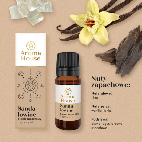 Olejek o zapachu drzewa sandałowego ma bogaty, balsamiczny i głęboki aromat, ma subtelnie słodkie i ciepłe nuty. Uspokajające działanie aromatu jest niezastąpione podczas medytacji, jogi lub praktyk uważności. Tworzy we wnętrzu ciepłą, spokojną i harmonijną atmosferę.