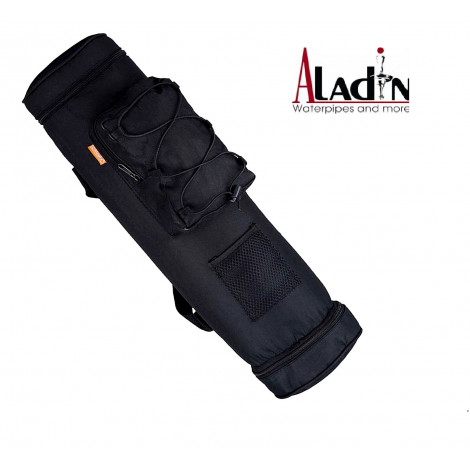 Wygodna i praktyczna torba na shishe, bongo czy jakąkolwiek inną fajkę wodną. Producentem torby jest marka Aladin Shisha, która dzięki swojemu wieloletniemu doświadczeniu stworzyła torbę, które w pełni nadaje się do transportu fajek wodnych. Torba wykonana jest z grubego materiału, wnętrze ścianek wypełnione jest specjalną pianką, która amortyzuje i zabezpiecza fajkę przed stłuczeniem. Dno torby posiada 2 komory z osobnym warstwami piankami, dodatkowo dno jest rozpinane, ma jakby 2 osobne komory, które możemy dodatkowo jeszcze wypełnić materiałem ochronnym.