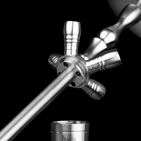 Aladin MVP jest bardzo wytrzymały i wykonany ze stali nierdzewnej V2A. Dzban w MVP Shisha wykonany jest z wytrzymałego szkła kryształowego, a rurka zanurzeniowa ma zintegrowany dyfuzor, który można dowolnie regulować. Dyfuzor pozwala na ciche bąbelkowanie fajki wodnej. W przypadku fajki wodnej Aladin MVP adapter głowicy, adaptery do rur i połączenia rurowe są ustawione na wysokiej jakości cięcie 18,8 mm, eliminując irytujące uszczelnienia rur, które często zawodzą. Ponadto ma to tę zaletę, że można również przymocować do kolumny dymu łapacz melasy o średnicy 18,8 mm, który utrzymuje sziszę w czystości z powodu spływającej melasy.