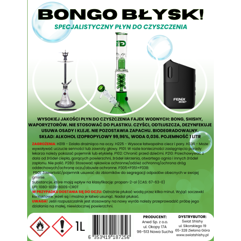 Specjalistyczny Płyn do czyszczenia Fajek wodnych wykonanych ze szkła takich jak Bonga i Shishe. Bardzo dobrze czyści powierzchnie szklane, skutecznie usuwa zanieczyszczenia takie jak osady, tłuszcz, brud, kleje nie pozostawiając przy tym zapachu ani śladów, ponieważ płyn po czasie odparowuje. Skutecznie czyści również powierzchnie metalowe. Dlatego idealnie nadaje się również do czyszczenia waporyztorów. Ma działanie dezynfekujące oraz odkażające, dlatego idealnie sprawdza się przy dezynfekcji waporyzatora przed pierwszym użyciem. Odkaża oraz dezynfekuje powierzchnie . Środek czyszczący do Vaporizerów, bonga i shish. Bardzo wydajny i efektywny.