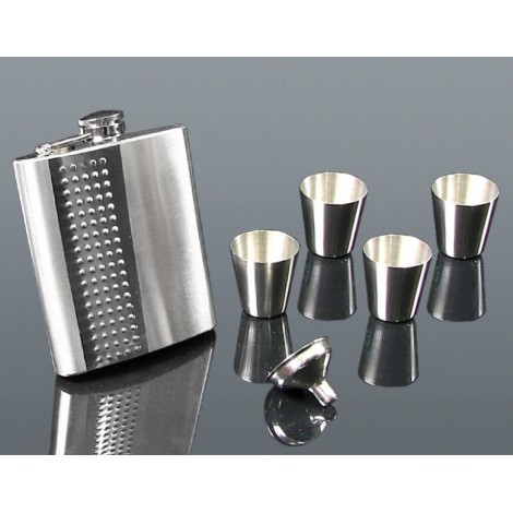 W skład którego wchodzą: Piersiówka ca 8 OZ - ca 240 ML, 4 kieliszków (4 x 35 ml) i lejka.