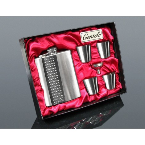 Elegancki zestaw prezentowy zapakowany w gustowne pudełko, z robiącą wrażenie czarną lub czerwoną aksamitną wyściółką. Idealnie nadaje się jako prezent. Umili również atmosferę każdego spotkania towarzyskiego. W zestawie można znaleźć piersiówkę z srebrnym kolorze z pionowymi grawerowanymi wypustkami wraz z czterema kieliszkami. Jako dodatek zestawu świetnie się sprawdzi praktyczny lejek, dzięki któremu w łatwy sposób można napełnić piersiówkę rozgrzewającym płynem.
