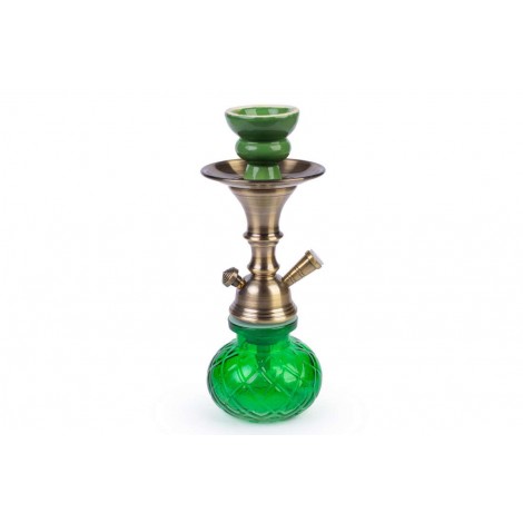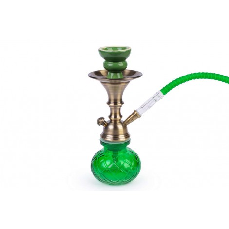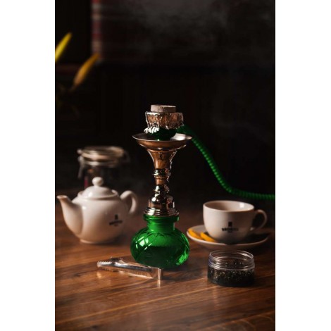 Oryginalny korpus w gustownym kolorze Mosiądzu, przyciąga wzrok przy tej shishy. W zestawie zielony klasyczny wąż, oraz zielony cybuch i ustnik z tworzywa sztucznego imitujący szkło, całość prezentuje się bardzo ładnie.