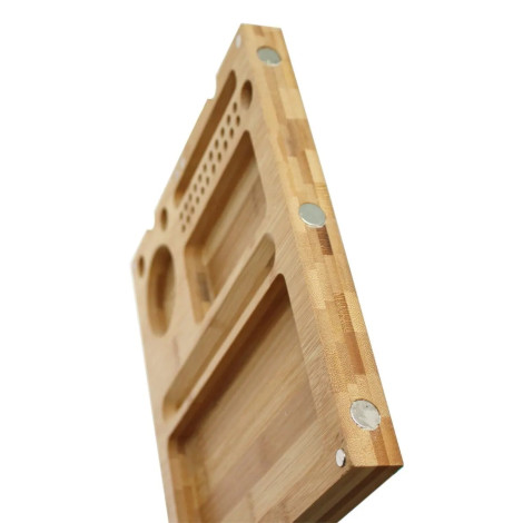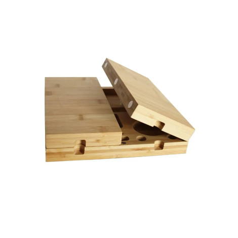 Bambusowa podstawka posiada aż 32 otwory np. na końcówki filtrów z węglem aktywnym o różnych rozmiarach (7 mm i 6 mm). Taca ma 8 wgłębień i przegródek na np. zioła, tytoń, czy krakersy, kiedy złapie nas gastrofaza. Znajdzie się także miejsce na zapalniczki, młynki i inne rodzaje praktycznych gadżetów do skręcania papierosów i papierosków ;)