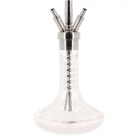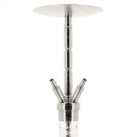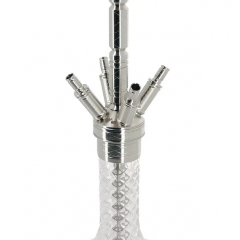 Szklany krystaliczny dzban w przezroczystym kolorze wykończonym na wysoki połysk, pięknie komponuje się ze srebrnymi elementami korpusu w tej shishy. Jest duża, porządnie wykonana, każdy element jest ciężki i masywny, wystarczy wziąć ja w dłoń i od razu czuć jej wartość.