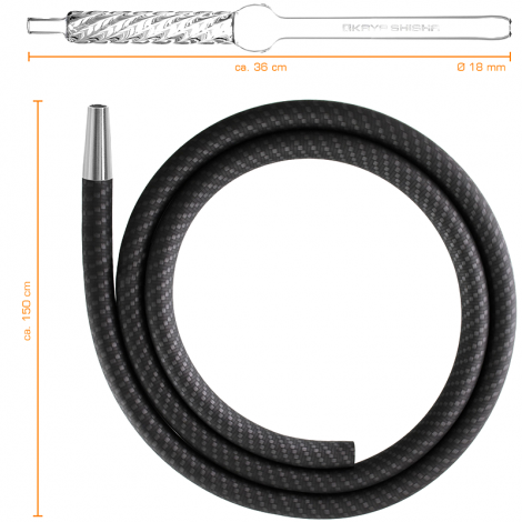 Wysokiej jakości wąż wykonany z silikonu ze szklanym ustnikiem marki Kaya. Wąż zaprojektowany w kolorze czarnym, jednak jego charakterystyczną cechą jest wzór tworzywa węglowego, który pokrywa cały przewód. Ustnik jest w całości wykonany ze szkła, dzięki czemu widać przelatujący przez niego dym podczas palenia. Posiada również zdobioną rączkę, która dodatkowo poprawia chwyt. Zestaw gotowy do podłączenia w shishy ponieważ posiada również konektor (końcówka do podłączenia w shishy) Cały zestaw bardzo ładnie się prezentuje, ładna kolorystyka carbon będzie pasowała do większości fajek wodnych.