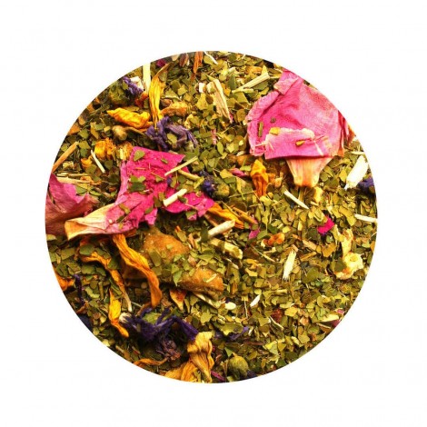 Ziołowa baza to kwiat słonecznika, piwonia, żen-szeń oraz kwiat malwy zwany dzikim ślazem. Całość została uzupełniona owocowymi dodatkami w postaci skórki pomarańczy i kawałków cytryny oraz ananasa.