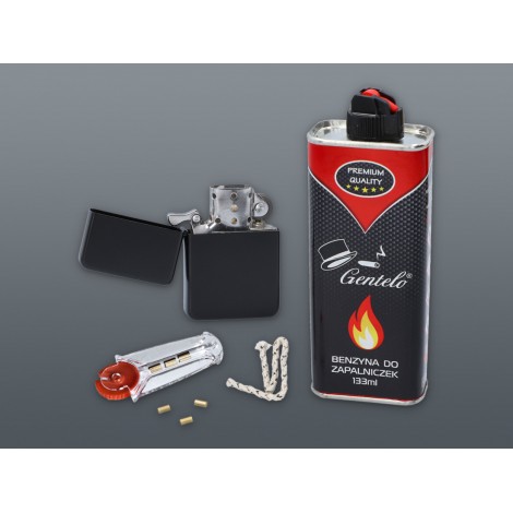 Benzynowa zapalniczka w klasycznym czarnym kolorze. Zapalniczka nie gaśnie przy lekkim deszczu czy wietrze co jest jej dodatkowym atutem. Kolejnym elementem są uniwersalne, wysokiej jakości kamienie do zapalniczek wraz z knotem i benzyną do napełnienia. Kompletny zestaw, który posłuży na długi czas używania.