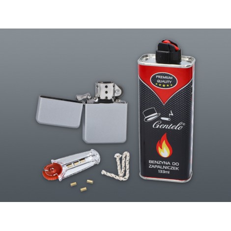 Benzynowa zapalniczka w klasycznym czarnym kolorze. Zapalniczka nie gaśnie przy lekkim deszczu czy wietrze co jest jej dodatkowym atutem. Kolejnym elementem są uniwersalne, wysokiej jakości kamienie do zapalniczek wraz z knotem i benzyną do napełnienia. Kompletny zestaw, który posłuży na długi czas używania.