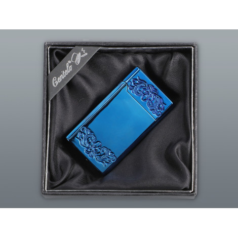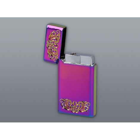 Zapalniczka żarowa o polerowanej powierzchni z połyskującym efektem rainbow lub niebieski metalic, ozdobiona z każdej strony eleganckim grawerem .