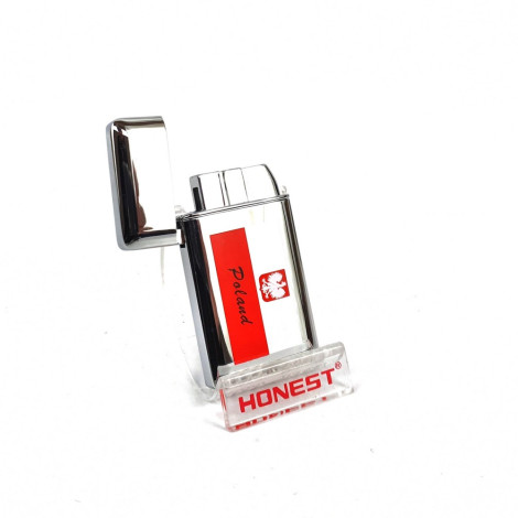 Zapalniczki żarowe Honest to najwyższa półka wśród zapalniczek żarowych. Srebrna, połyskująca zapalniczka z flagą Polski oraz napisem "POLAND".