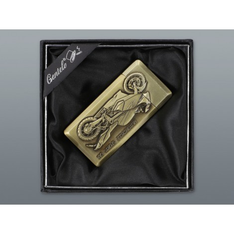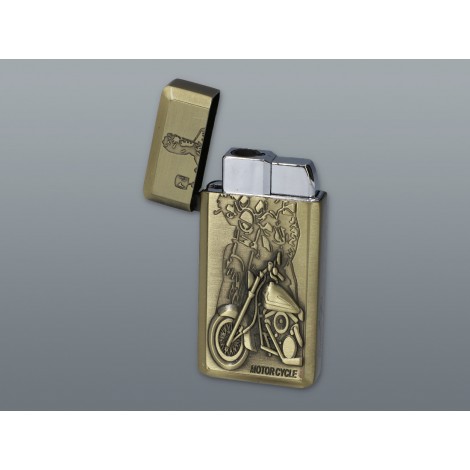 Zapalniczka żarowa ze wypukłym wzorem, motocykla, precyzyjnie oddająca szczegóły. Posiada podnoszoną klapkę, pod którą znajduje się przycisk włączający, utrzymany w srebrnej kolorystyce.